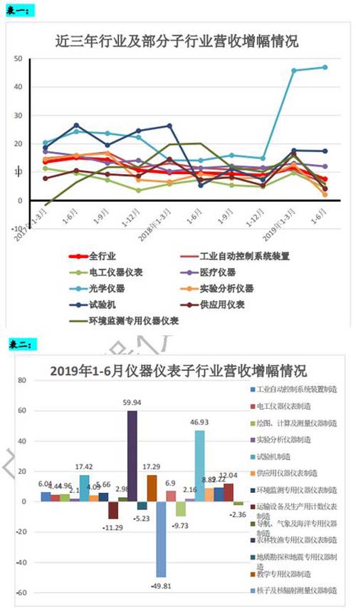 國家統計局數據顯示,2019年上半年儀器儀表大行業規模以上企業4927個,營收規模4002億元,營收同比7.57%;利潤總額為361億元,同比增長 2.87%,比主營收入低4.70個百分點;期間費用中,財務費用同比 19.53%增幅較高,利息同比23.20%;負債總計同比10.15%;管理費用同比增幅0.26%;應收賬款同比增長7.73%,資產負債率為45.50%,高於去年同期1.96個百分點。根據海關統計2019年1-6月進口總額246.6億美元,出口總額150.9億美元。進出口逆差達95.7億美元,比去年同期下降13%。