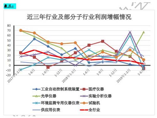 2、利潤。利潤總額增幅低於營收增幅4.7個百分點,其中:光學儀器利潤增幅高於營收增幅20多個百分點,衡器、地質儀器、供應用儀表的利潤增幅亦遠高於營收增幅,實驗分析利潤增幅基本穩定;而醫療儀器、汽車儀表、環境監測等幾個分行業利潤增幅遠低於營收增幅,自動化儀表行業的利潤增幅僅為-1.58%;行業增產不增收或增收不增利的情況加劇,盈利能力提升壓力很大。