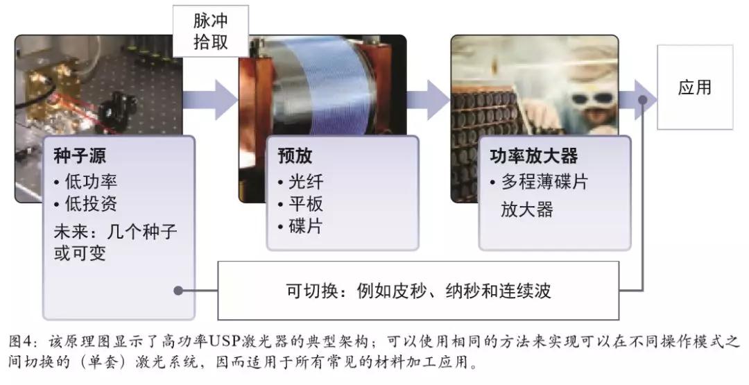 提供高平均功率的超短脈衝(chong) 激光係統,都基於(yu) 小的種子振蕩器和一個(ge) 或多個(ge) 放大級(圖4)。重要的是,在高平均功率下,這些放大器(例如片狀預放大器和多程碟片功率放大器)對於(yu) 超短脈衝(chong) 或CW輻射同樣有效。因此,通過集成額外或更靈活的種子源,沒有技術上的原因會(hui) 阻礙我們(men) 建立一個(ge) 可以在CW和脈衝(chong) 或 USP 操作之間切換的單套激光係統。