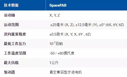 這一任務通過一個(ge) SpaceFAB定位機器人完成,其可在所有直線和角度方向上實現六自由度運動。SpaceFAB專(zhuan) 門針對高真空使用而定製,極其緊湊,配備真空兼容型步進電機,可適用於(yu) -50至+80攝氏度的溫度範圍。