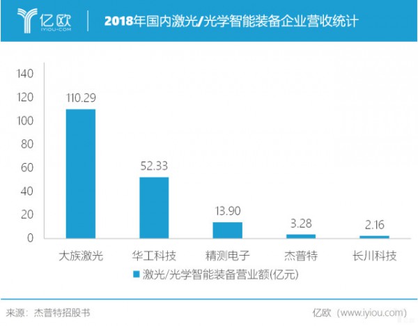 數據表明,2018年傑普特的激光/光學智能裝備業(ye) 務營收為(wei) 2.16億(yi) 元,相比大族激光110.29億(yi) 元、華工科技52.33億(yi) 元、精測電子13.90億(yi) 元的營收額,該項業(ye) 務仍需加碼助力,才能趕超同行搶奪市場份額。