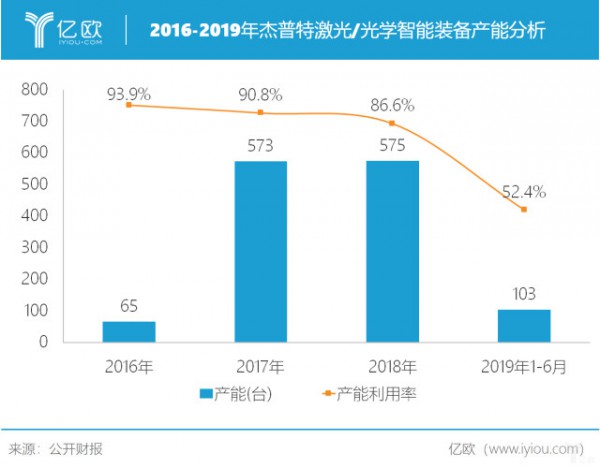 事實上,傑普特的總利潤下滑還與(yu) 其激光/光學智能裝備產(chan) 能驟減密不可分。從(cong) 近幾年的激光/光學智能裝備產(chan) 能來看,其產(chan) 品產(chan) 能在2017年和2018年分別為(wei) 573台和575台,但在今年的上半年,驟降至103台,與(yu) 前兩(liang) 年同期對比差距較大,傑普特準備切換“戰術”了嗎?