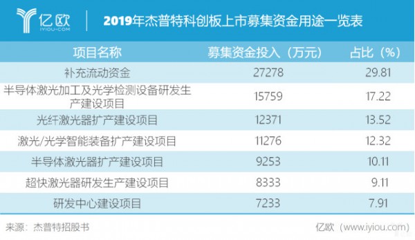 根據傑普特的招股書(shu) 顯示,本次募集的資金29.81%將用於(yu) 補充流動資金,另外七成資金將用於(yu) 激光/光學智能裝備和激光器項目生產(chan) 、擴產(chan) 以及研發中心的建設。這樣的打法,也說明了此次傑普特抱著“壯士斷腕”的決(jue) 心,勢必要加強自身核心技術的研發,實現產(chan) 能的再次激增。