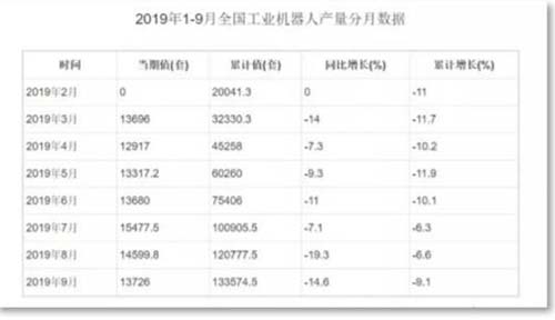 自2018年9月份以來,中國工業機器人產量已連續12個月下滑(至2019年9月)。