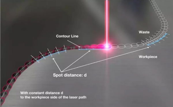 特別是對於(yu) 切割應用,穩定的脈衝(chong) 間隔對於(yu) 加工結果和切割邊緣的質量至關(guan) 重要。其他具有脈衝(chong) 控製的係統僅(jin) 允許通過兩(liang) 個(ge) 脈衝(chong) 的中間點來定義(yi) 兩(liang) 個(ge) 脈衝(chong) 之間的距離. 而XLSCAN的脈衝(chong) 控製方式以考慮精度為(wei) 優(you) 先條件.它允許激光脈衝(chong) 間隔不僅(jin) 可以根據激光路徑中心線來調整,而且可以根據光斑路徑內(nei) 部或外部輪廓來調整.這確保了均勻的能量分布和工件邊緣的精確加工. 在圖4中,工件邊緣激光脈衝(chong) 的等間隔分布(藍線)描述了這一功能. 對於(yu) 敏感的工件材料(例如薄膜), 這種方法可以避免燒焦和切割不均勻.