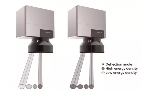 即使使用遠心鏡頭,作用在工件上的激光光斑大小還是會(hui) 隨著掃描頭內(nei) 鏡片的偏轉角度而變化. XL SCAN的軌跡規劃可以根據偏轉角度調整激光參數。這種情況下即便光斑大小在沿著激光路徑有很小的變化,其能量密度也能保持不變.因此,激光在薄膜和其他材料上的均勻加工得以實現.