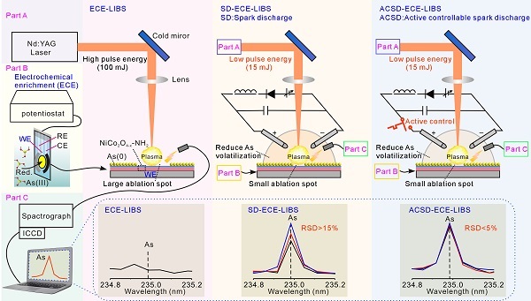 圖:電化學-LIBS設備,火花放電-電化學-LIBS設備和主動可控火花放電-電化學-LIBS設備檢測As(III)的示意圖