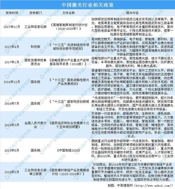 在國家產(chan) 業(ye) 政策的推動下,我國工業(ye) 製造步入轉型升級時代。激光技術作為(wei) 現代高端製造技術,為(wei) 我國製造業(ye) 升級提供了技術支持,是提升我國製造業(ye) 競爭(zheng) 力的重要手段,國家高度重視激光產(chan) 業(ye) 的發展。精密加工技術和設備被列為(wei) 《優(you) 先發展的高技術產(chan) 業(ye) 化重點領域指南(2007年度)》中優(you) 先發展的18項先進製造之一,成為(wei) “國家優(you) 先發展的高新技術產(chan) 業(ye) 化重點領域”。在我國製造產(chan) 業(ye) 發展綱領文件《中國製造2025》中,明確提出圍繞重點行業(ye) 轉型升級和新一代信息技術、智能製造、增材製造(3D打印)等領域創新發展的重大共性需求,形成一批製造業(ye) 創新中心,重點開展行業(ye) 基礎和共性關(guan) 鍵技術研發、成果產(chan) 業(ye) 化、人才培訓等工作。穩定的需求增長及良好的政策環境,都表明我國激光產(chan) 業(ye) 具備廣闊的市場發展前景。