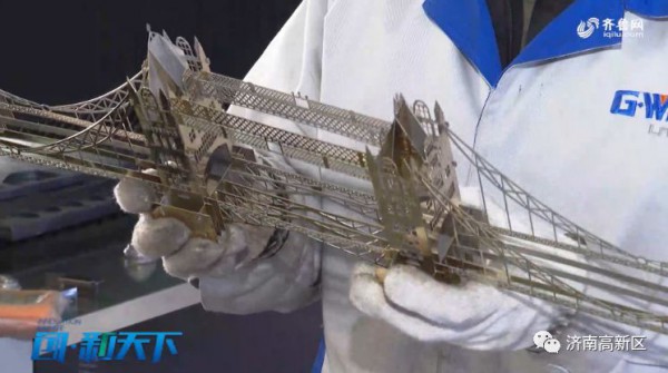 在濟南金威刻的展廳內(nei) ,擺放著很多精致的碳鋼與(yu) 不鏽鋼工藝品,而這些都是由激光切割零件拚接而成,其中最厚的碳鋼切割零件達到50毫米。而售後工程師梁瑞月手中的塔橋所使用的不鏽鋼厚度隻有0.3毫米,在這樣單薄的不鏽鋼板上,雕刻出這樣緊密複雜的花紋,對速度和精確度要求都很高。