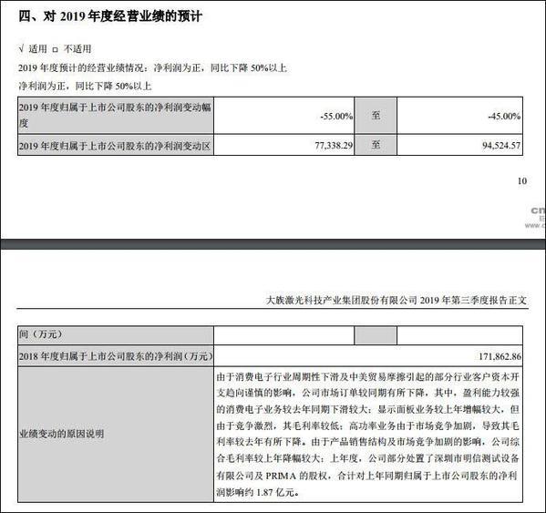 針對2019年前三季度業(ye) 績的大幅下滑,大族激光曾解釋稱,“由於(yu) 消費電子行業(ye) 周期性下滑及中美貿易摩擦引起的部分行業(ye) 客戶資本開支趨向謹慎的影響,大族激光市場訂單較2018年同期有所下降,其中,盈利能力較強的消費電子業(ye) 務較2018年同期下滑較大”。