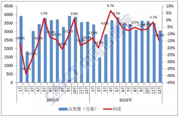 圖4 2018年/2019年國內(nei) 智能手機出貨量及增長趨勢