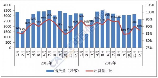 智能手機出貨量。2019年12月,智能手機出貨量2893.1萬(wan) 部,同比下降13.7%,占同期手機出貨量的95.0%,其中androids手機在智能手機中占比89.0%。2019年全年,智能手機出貨量3.72億(yi) 部,同比下降4.7%,占同期手機出貨量的95.6%,其中androids手機在智能手機中占比91.2%。