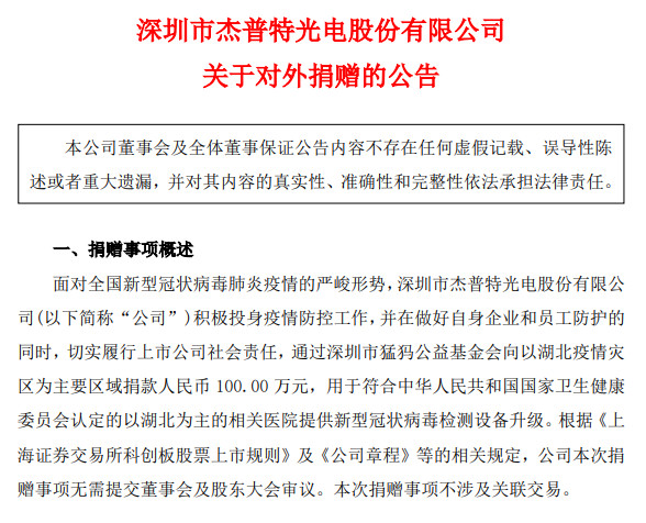 2月3日晚,深圳市傑普特光電股份有限公司發布關(guan) 於(yu) 對外捐贈的公告。公告表示,麵對全國新型冠狀病毒肺炎疫情的嚴(yan) 峻形勢,公司積極