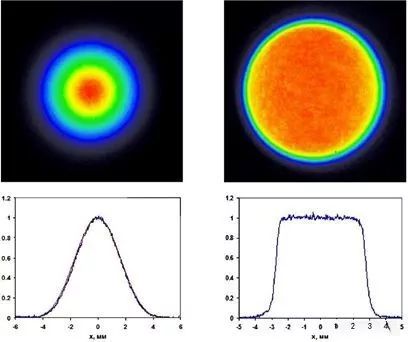 一般來說,激光器輸出光束根據物理特性可分為(wei) 單模(single mode)和多模(multi-mode)兩(liang) 種。按照光束質量M2因子的不同,我們(men) 可以將M2因子小於(yu) 1.3的單模激光稱為(wei) 純單模(pure single mode),其LP01模的能量占比接近100%。M2因子在1.3~2.0之間的單模激光稱為(wei) 準單模(quasi single mode),其LP01模的能量占比超過90%並出現少量的LP11模和LP02模。多模激光M2因子大於(yu) 2.0,這種模式下輸出纖芯較大(一般在50μm及以上),模式數目較多。從(cong) 能量空間分布特征上來看,單模激光呈現典型的高斯分布,如圖1左所示,而多模激光則是由多個(ge) 激光模式疊加起來,典型的分布形態是平頂,如圖1右所示。