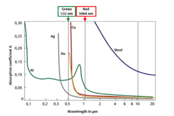 不同材料對不同波長激光的吸收率如圖3所示,從(cong) 圖中可以看出,用光纖激光(典型波長1080nm)加工高反材料(如Cu、Al、Ag等)時,吸收率極低,常溫下紫銅對1080nm激光的吸收率隻有不到5%, 如此低的吸收率使得一般的光纖激光器很難用於(yu) 加工特別是焊接紫銅、鋁合金等高反材料,這主要體(ti) 現在兩(liang) 方麵:一方麵要求非常高的功率(6mm紫銅焊接,多模激光器的功率需要高達15000W),另一方麵高的反射率會(hui) 引起頻繁的報警甚至會(hui) 對激光器產(chan) 生不可逆的破壞。所以目前市場上使用光纖激光器焊接高反材料(特別是紫銅)的成功應用案例還不多,雖然通快針對這一痛點推出了綠光激光來解決(jue) 這個(ge) 問題,但是目前綠光激光在工業(ye) 上應用存在功率不足和成本高的兩(liang) 大難題。