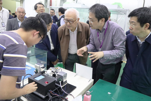 眾(zhong) 多院士和專(zhuan) 家參觀並聽取國誌激光首席科學家馬修泉教授講解自主研發的高精度旋轉光纖塗層剝除機、全尺寸光纖塗層熱剝除刀、全自動光纖切割刀等上遊關(guan) 鍵設備演示和介紹(前排從(cong) 右向左為(wei) :翟婉明院士、馬修泉教授、段正澄院士、郭萬(wan) 林院士)