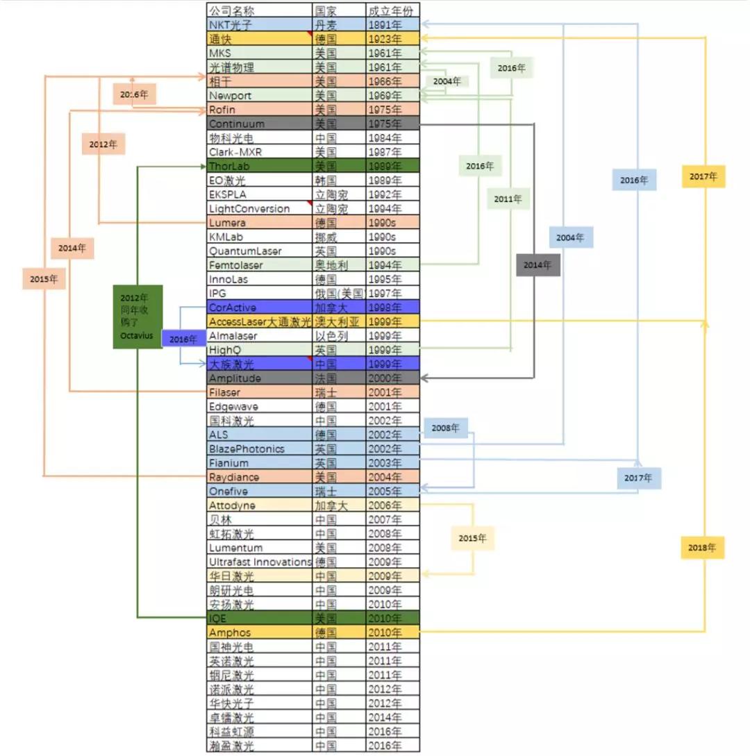 全球超快激光企業(ye) 成立時間表及收購關(guan) 係(來源:平安證券)