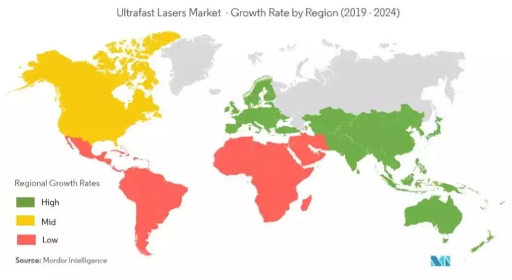 根據 Mordor Intelligence 統計和預測,2018 年全球超快激光市場價(jia) 值33.7億(yi) 美元,預計到2024年將達到128.2億(yi) 美元,CAGR 為(wei) 25.02%。其中亞(ya) 洲和歐洲市場將是市場增速最快的區域,潛在市場可觀。