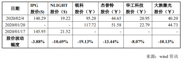 從上表來看,IPG 的生產基地主要在美國、德國、俄羅斯等產地,影響較小, 股價下降 3.88%;NLIGHT 的模塊生產基地在中國上海,高功率光纖激光器的銷售市場主要亦在上海,故屬於生產和銷售皆受到疫情的影響,股價下降 10.69%;銳科激光、傑普特激光兩家光源上市公司股價下降超過 13%,同時,老牌激光設備上市公司大族激光、華工科技股價降幅都超過 8%。
