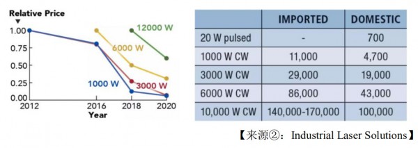 目前國內的光纖激光器上遊的核心器件基本實現全國產化,降低了器件的成本,進一步加速了產能擴張,使得產品具備持續降價的潛力。