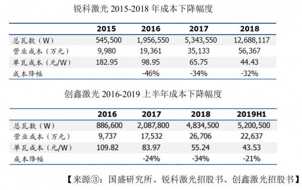 隨著光纖激光器市場規模的不斷擴大、激光產業鏈的不斷成熟,激光器的核心器件國產化率不斷提高,激光器的成本不斷下降。如下圖所示,國內典型光纖激光器企業銳科激光及創鑫激光自 2016 年以來每年的成本下降幅度均超過20%,市場規模的擴大和產業鏈的不斷細化使得激光器的原材料材料呈現出不斷下降的趨勢。