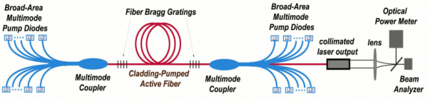 二極管多點耦合入有源光纖,無限製攝入光子,光纖端麵無熱點,分布式發射,長距離吸收-高效泵浦吸收。