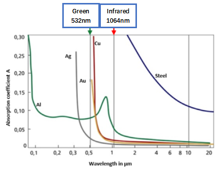 不同材料對不同波長激光的吸收率如圖3所示,從圖中可以看出,用光纖激光(典型波長1080nm)加工高反材料(如Cu、Al、Ag等)時,吸收率極低,常溫下紫銅對1080nm激光的吸收率隻有不到5%, 如此低的吸收率使得一般的光纖激光器很難用於加工特別是焊接紫銅、鋁合金等高反材料,這主要體現在兩方麵:一方麵要求非常高的功率(6mm紫銅焊接,多模激光器的功率需要高達15000W),另一方麵高的反射率會引起頻繁的報警甚至會對激光器產生不可逆的破壞。所以目前市場上使用光纖激光器焊接高反材料(特別是紫銅)的成功應用案例還不多,雖然通快針對這一痛點推出了綠光激光來解決這個問題,但是目前綠光激光在工業上應用存在功率不足和成本高的兩大難題。