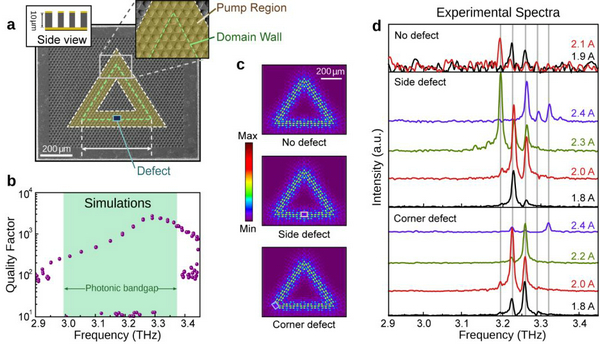 實驗表明三角形拓撲激光器的本征模式類似於(yu) 圓盤或環形腔中的回音壁模式。在3.192、3.224、3.258、3.288 THz處有規整間隔的激射峰(實心垂直灰線);平均自由光譜範圍(FSR)與(yu) 計算的本征模頻率的FSR相當。即使在三角形不同位置引入缺陷,激射峰的間距仍然保持了一定的魯棒性,充分說明缺陷的引入不會(hui) 破壞激光模式的行波波特性。為(wei) 了比較,研究人員用同樣的穀光子晶體(ti) 參數設計製作了一個(ge) 由光子晶體(ti) 波導(單元格具有統一的取向)形成的三角形諧振腔激光器。測試發現激光器的光譜上有隨機分布的激射峰,並且缺陷的位置對激射峰影響顯著。當缺陷位置移動到三角形空腔的一個(ge) 角落時,將觀察到一組全新的發射峰。數值模擬顯示大量的本征態分布在光子能帶隙的上半部分,本征模式的頻率沒有明顯的規整間隔,模式的能量分布在三角形的不同部分。這反映了傳(chuan) 統波導模式有局部化的趨勢,區別於(yu) 穀邊緣拓撲態模式。