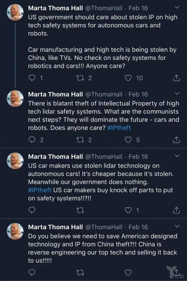 2月16日,Velodyne總裁Marta Thoma Hall在個(ge) 人推特賬號上連發四條推文,指責中國競爭(zheng) 對手竊取知識產(chan) 權逆向工程。