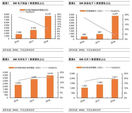 電子行業(ye) 1季度為(wei) 傳(chuan) 統淡季。SW電子板塊四個(ge) 一級子行業(ye) 中,電子製造行業(ye) 營收規模最大,2018年營收8319億(yi) 元,1季度占全年營收比例為(wei) 8%;其他電子2018年營收4247億(yi) 元,1季度占全年營收比例為(wei) 4%;光學電子行業(ye) 2018年營收3919億(yi) 元,1季度占全年營收比例為(wei) 20%;元件行業(ye) 2018年營收1911億(yi) 元,1季度占全年營收比例為(wei) 20%。綜合來看,SW電子板塊1季度占全年營收的比例逐年下降,2018年SW電子板塊1季度營收占比為(wei) 10.7%,我們(men) 認為(wei) ,電子行業(ye) 1季度為(wei) 傳(chuan) 統淡季,營收占比不足15%,防控得當的情況下,疫情造成短期的需求不足、複工推遲、物流受限等因素對電子行業(ye) 全年影響有限。