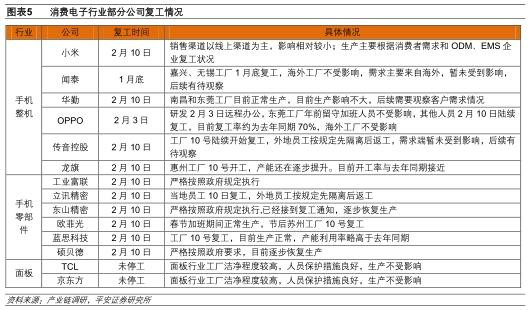 本周為(wei) 疫情影響下節後複工第二周,消費電子相關(guan) 企業(ye) 逐步恢複生產(chan) ,開工情況相對於(yu) 首周有較大提升,但產(chan) 能利率維持低位,大部分企業(ye) 產(chan) 能利用率維持在30%-50%區間;我們(men) 梳理了消費電子行業(ye) 具有代表性的公司的情況,整體(ti) 來看,絕大部分企業(ye) 已經開始恢複生產(chan) 。