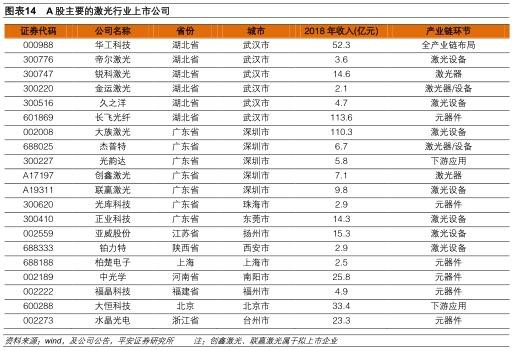 此次疫情爆發,對國內(nei) 激光設備產(chan) 業(ye) 鏈公司額複工產(chan) 生了一定的影響,尤其,此次最嚴(yan) 重的疫區——湖北,是我國重要的激光產(chan) 業(ye) 集聚地之一。據我們(men) 統計,目前A股激光行業(ye) 上市公司共20家(含擬上市的兩(liang) 家),其中武漢市的企業(ye) 共6家,占比30%。若依照上市公司收入計算,2018年,武漢市激光行業(ye) 上市公司收入合計約191億(yi) 元,約占所有行業(ye) 內(nei) 上市公司的42%。