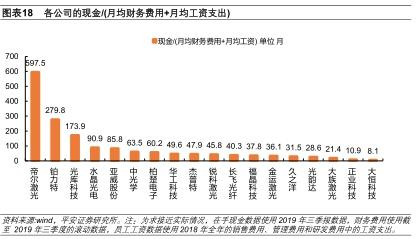我們(men) 分析了A股激光行業(ye) 上市公司目前的現金、債(zhai) 務、存貨情況,認為(wei) 雖然目前複工和銷售受到一定的阻礙,但在短期內(nei) ,大多數上市公司的現金流風險是可控的。如果做極端假設,停工期間所有經營活動停止,企業(ye) 短期僅(jin) 需支付財務費用和員工工資,多數上市公司的在手現金可維持時間均在12個(ge) 月以上;若考慮房屋租金等支出,情況可能更加嚴(yan) 峻一些,但我們(men) 判斷1-2個(ge) 月的疫情影響並不足以使上市公司麵臨(lin) 重大的現金流困境。