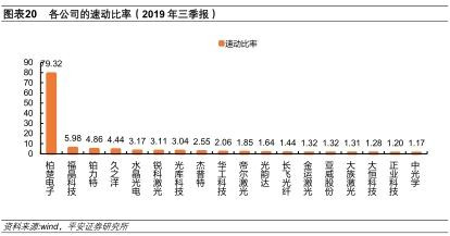 此外,債(zhai) 務為(wei) 上市公司現金流帶來的壓力也普遍不大。激光裝備製造業(ye) 並不是一個(ge) 高負債(zhai) 的行業(ye) ,從(cong) 2019年Q3的數據看,相關(guan) 上市公司中僅(jin) 一家資產(chan) 負債(zhai) 率高於(yu) 50%。從(cong) 2019年Q3的速動比率來看,行業(ye) 內(nei) 所有上市公司均超過1倍,約半數的上市公司超過2倍,風險整體(ti) 可控。