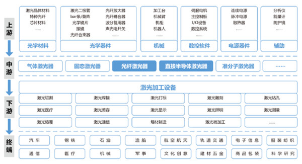 激光器行業(ye) 位於(yu) 激光產(chan) 業(ye) 中遊,其上遊為(wei) 光學材料、光學器件、數控係統以及電學器件生產(chan) 企業(ye) ;下遊是將各部件集成出品的激光加工設備生產(chan) 商。