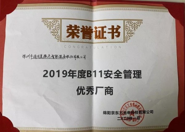 日前,從(cong) 海目星精密激光中心(PLBG)傳(chuan) 來捷報:海目星榮獲京東(dong) 方(BOE)2019年度安全管理優(you) 秀廠商。此次評選,海目星憑借設備的穩定運行、完善的現場管控流程及現場人員的積極應對,在京東(dong) 方(BOE)安全管理會(hui) 的綜合考評中得分名列前茅,以絕對的優(you) 勢從(cong) BOE眾(zhong) 多的供應商中脫穎而出,是榮獲該獎項 5家企業(ye) 中唯一的國內(nei) 企業(ye) 。