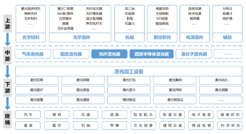激光器行業位於激光產業中遊,其上遊為光學材料、光學器件、數控係統以及電學器件生產企業;下遊是將各部件集成出品的激光加工設備生產商。