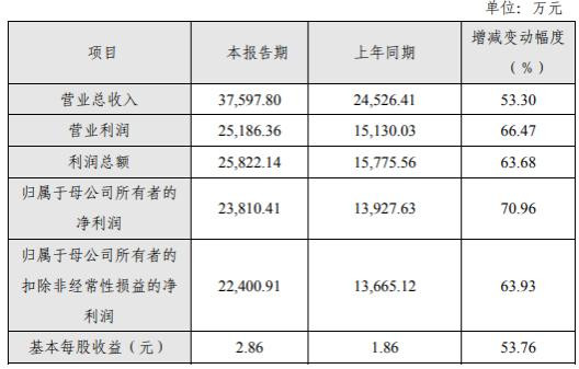 據了解,報告期內(nei) 公司實現營業(ye) 收入37,597.80萬(wan) 元,同比增長53.30%;實現歸屬於(yu) 母公司所有者的淨利潤23,810.41萬(wan) 元,同比增長70.96%;報告期末總資產(chan) 221,089.32萬(wan) 元,較期初增長503.98%;歸屬於(yu) 母公司的所有者權益213,993.41萬(wan) 元,較期初增長637.54%。