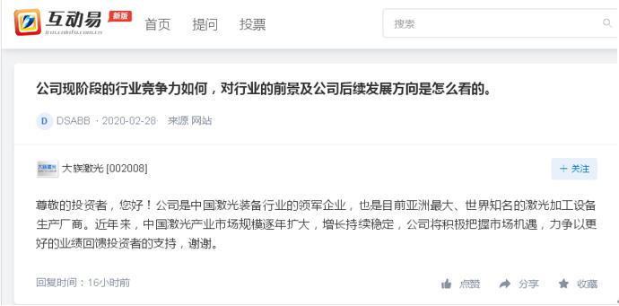 另外,亦有投資者對大族激光現階段競爭(zheng) 力提出疑問。大族激光董秘回複表示,公司是fun88官网平台裝備行業(ye) 的領軍(jun) 企業(ye) ,也是目前亞(ya) 洲最大、世界知名的激光加工設備生產(chan) 廠商。近年來,fun88官网平台產(chan) 業(ye) 市場規模逐年擴大,增長持續穩定,公司將積極把握市場機遇,力爭(zheng) 以更好的業(ye) 績回饋投資者的支持。