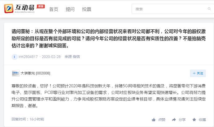 對此業(ye) 績,不少投資者紛紛表示擔憂。有投資者在互動易裏提到,“從(cong) 現在整個(ge) 外部環境和公司的內(nei) 部經營狀況來看對公司都不利,公司對今年的股權激勵所定的目標是否有能完成的可能?請問今年公司的經營狀況是否有實質性的改善”,對此,大族激光董秘回複表示,公司預計2020年是科技創新大年,伴隨5G網絡相關(guan) 技術的普及,將顯著帶動下遊消費電子、顯示麵板、PCB等行業(ye) 對激光加工設備的需求,公司對應板塊業(ye) 務有望實現快速增長。公司將努力提升公司經營管理水平和盈利能力,力爭(zheng) 完成股權激勵方案設定的業(ye) 績考核目標。