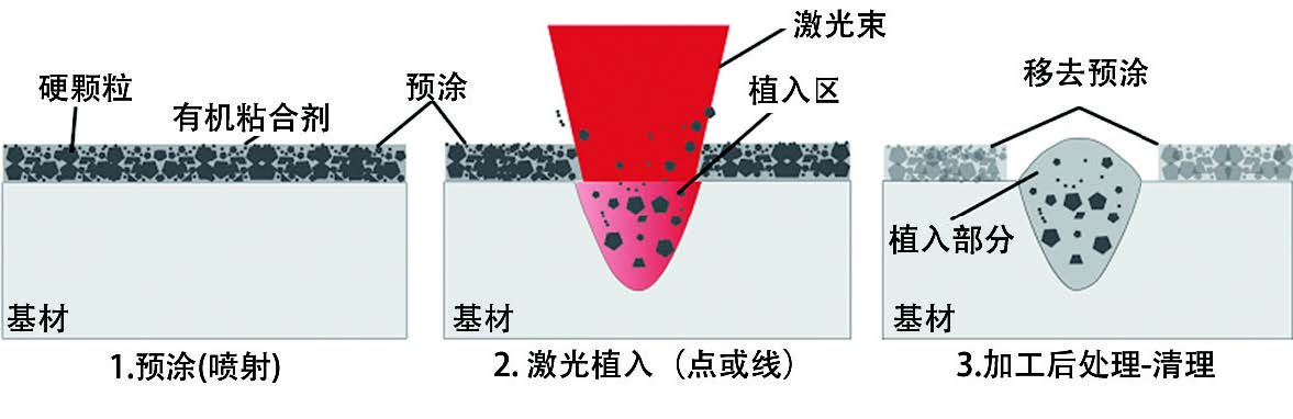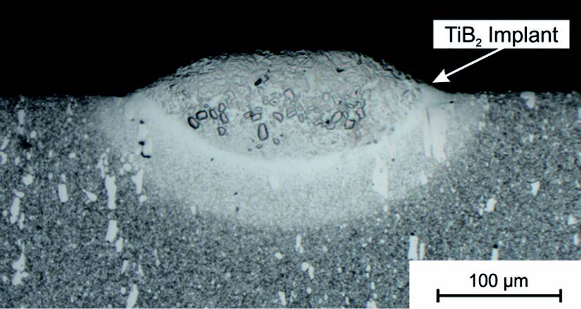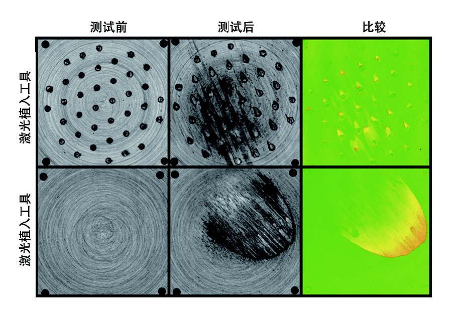 研究人員們計劃使用一種稱為激光植入的技術來解決這個問題,該技術主要為——使用脈衝激光在表麵內使表麵局部分散出鈦化合物(例如 TiN,TiC,TiB2 等鈦化合物製成)的硬陶瓷顆粒,來產生微結構從而表現出耐磨性能。通過使用激光植入技術,就可以在衝壓工具的表麵上產生圓頂狀的微結構,尤其當使用 TiB2 顆粒時,可以提供高達1600維氏的硬度值。根據 Spranger 的研究,這些微結構已被證明在減少成形工具的磨損方麵非常有效。