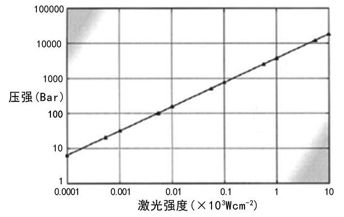 在高功率密度下,覆蓋物表麵吸收激光能量後達到蒸發溫度,蒸氣部分被電離產生等離子體,等離子體會繼續強烈吸收激光能量。覆蓋物被等離子體屏蔽而遠離激光時,最初的表麵蒸發停止。當激光脈衝繼續作用時,蒸氣進一步受熱,產生高壓(1~100kbar),導致目標材料表麵產生微觀壓力的衝擊波,再當激光脈衝停止作用時,等離子體從表麵擴張,材料表麵弛豫,薄薄的表層(1~100μm)被碎裂直至剝落。