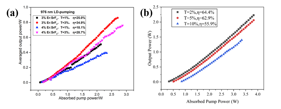 Er3+:SrF2單晶光纖的2.8 μm CW激光輸出功率(a)和Tm3+:CaF2單晶光纖的1.9 μm CW激光輸出功率(b)