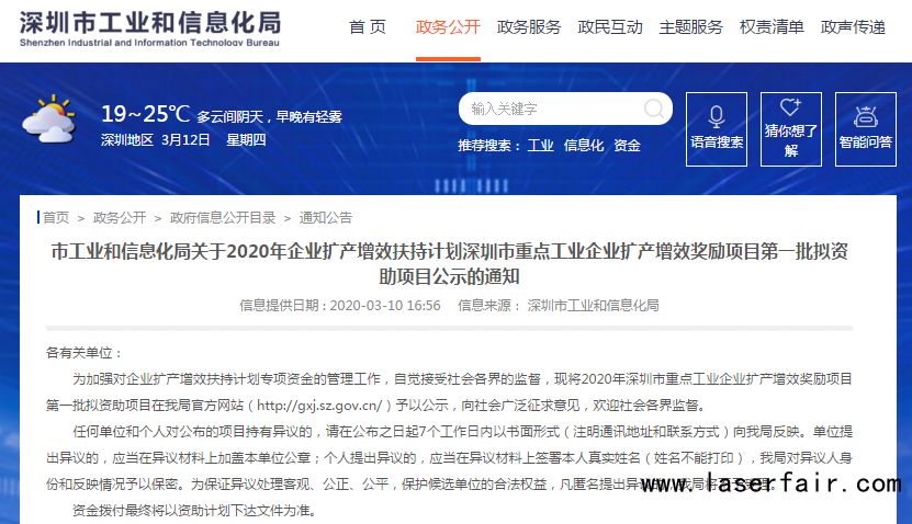 通知提出:為(wei) 加強對企業(ye) 擴產(chan) 增效扶持計劃專(zhuan) 項資金的管理工作,自覺接受社會(hui) 各界的監督,現將2020年深圳市重點工業(ye) 企業(ye) 擴產(chan) 增效獎勵項目第一批擬資助項目在我局官方網站(https://gxj.sz.gov.cn/)予以公示,向社會(hui) 廣泛征求意見,歡迎社會(hui) 各界監督。