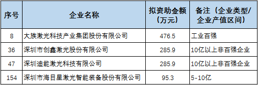 2020年重點工業(ye) 企業(ye) 擴產(chan) 增效獎勵項目擬資助計劃(第一批)名單共有214家企業(ye) ,擬資助金額總計達3.95億(yi) 元。其中激光企業(ye) 有4家,分別是大族激光、創鑫激光、迪能激光、海目星激光。
