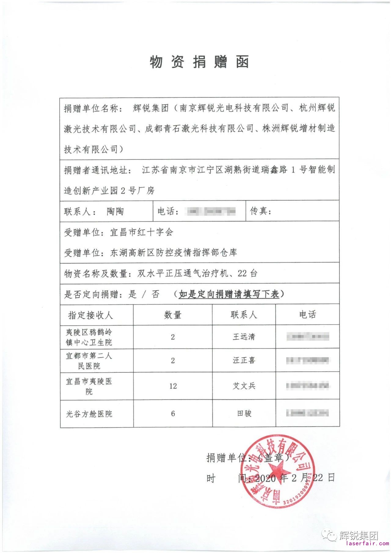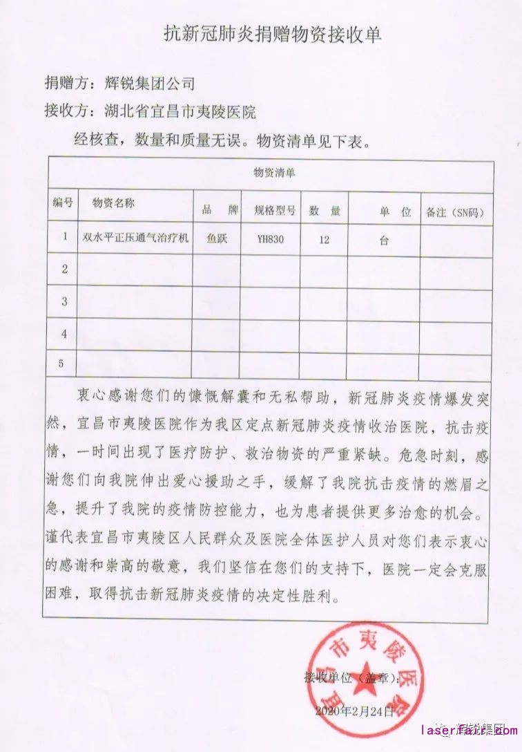 inkMacSystemFont, "Helvetica Neue", "PingFang SC", "Hiragino Sans GB", "Microsoft YaHei UI", "Microsoft YaHei", Arial, sans-serif; font-size: 17px; text-align: justify; background-color: rgb(255, 255, 255); letter-spacing: 2px; box-sizing: border-box !important;">2020年2月22日,輝銳集團,暨南京輝銳光電科技有限公司、成都青石激光科技有限公司、株洲輝銳增材製造技術有限公司、杭州輝銳激光技術有限公司及輝銳集團全體(ti) 員工,捐贈一批疫區急需的醫療物資,價(jia) 值30多萬(wan) 元的醫用呼吸機22台,到湖北一線醫院,為(wei) 湖北同胞打好抗擊疫情的狙擊戰,取得抗疫的最終勝利,貢獻我們(men) 的綿薄之力和輝銳人的愛心。這批呼吸機定向捐贈的醫院包括武漢光穀方艙醫院,宜昌市夷陵醫院,宜都市第二人民醫院,宜昌市夷陵區鴉鵲嶺鎮中心衛生院。