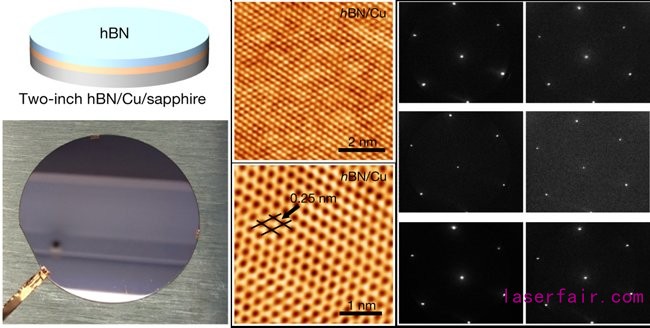 近日,中國科學院大連化學物理研究所催化基礎國家重點實驗室研究員傅強團隊與(yu) 台積電(TSMC)Lain-Jong Li團隊、台灣交通大學Wen-Hao Chang團隊、美國萊斯大學B. I. Yakobson團隊、北京大學教授張豔峰團隊合作,在2英寸晶圓襯底上成功外延生長單晶六方氮化硼(hBN)單層薄膜。