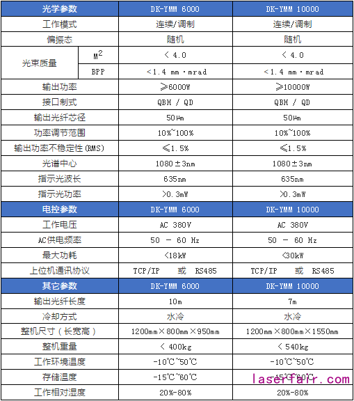 與(yu) 眾(zhong) 不同,湖南大科激光有限公司近年推出了高亮度大功率多模光纖激光器,引領了多模光纖激光器發展的潮流。以6kW和10kW光纖激光器為(wei) 例,大科激光的高亮度多模激光產(chan) 品參數如下表所示: