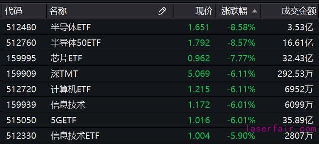 另外,科技板塊相關(guan) ETF同樣跌幅較大,半導體(ti) (512480.SH)、半導體(ti) 50(512760.SH)跌超8%,芯片ETF、計算機(512720.SH)、信息技術以及5GETF(515050.SH)等這些此前大火的ETF基金均大幅回調。