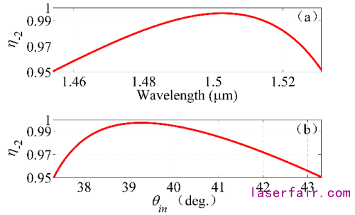 該結構衍射效率最高可達99.58%,並且實現波長從(cong) 1.454 μm-1.531 μm和入射角37.32°-43.3°範圍內(nei) 95%以上高效率輸出。研究結果表明,該結構同樣具有優(you) 良的容差特性,可行性強,適合工業(ye) 化大批量生產(chan) 製作。